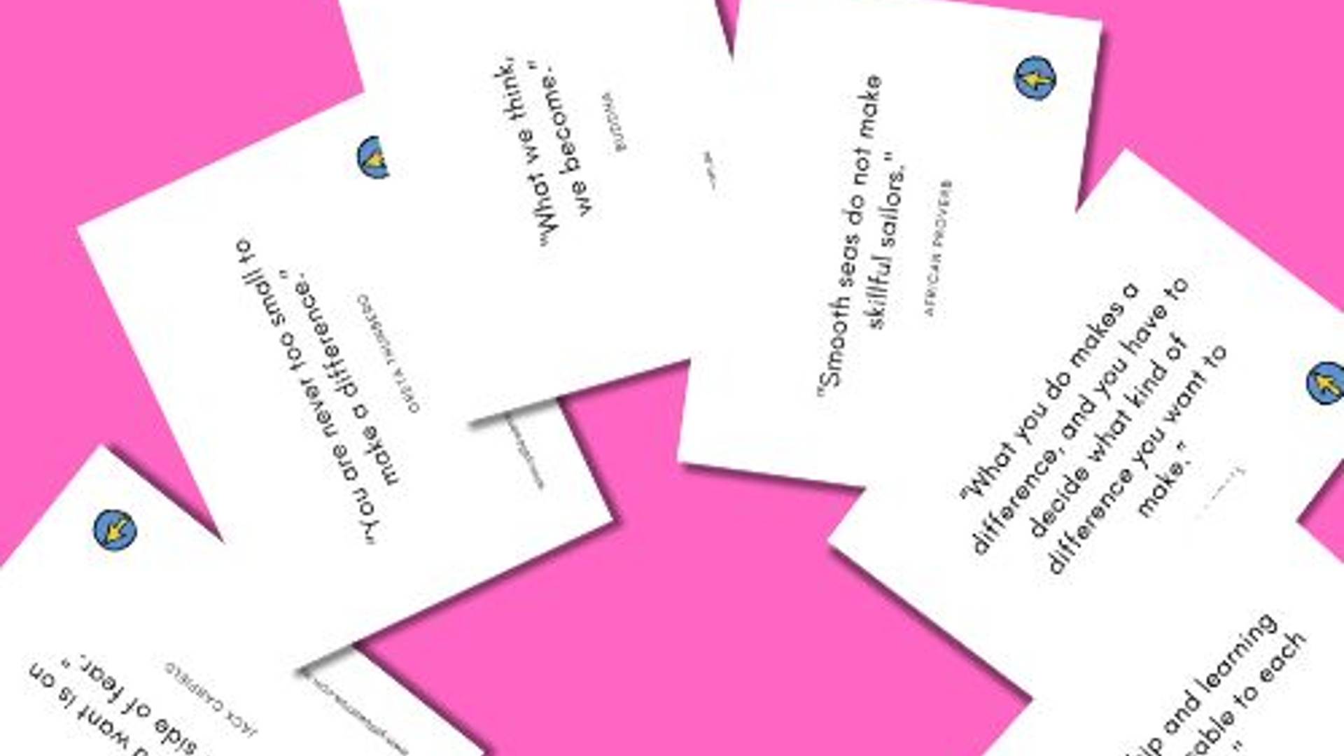 The deck includes three categories: issues, idea formats, and resources. Students draw one of each to spark new ideas. Each card has a quote on the back to prompt further discussion.